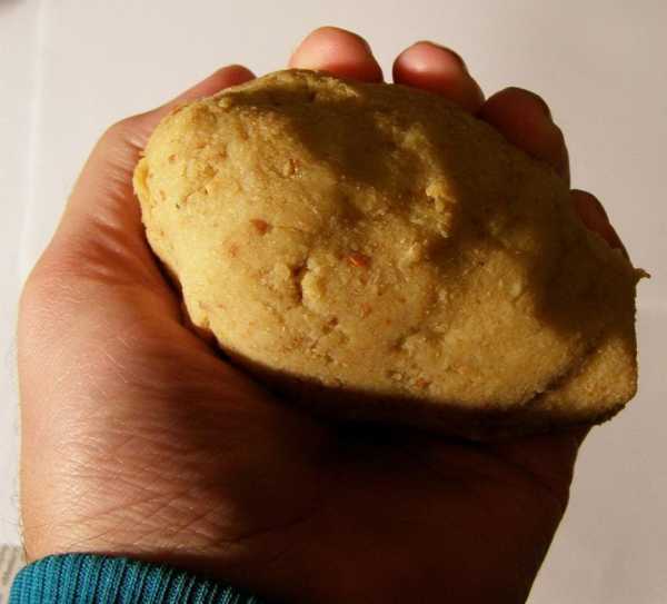 - Четвертый вариант. Хлеб смачиваем в воде, выжимаем его и перемешиваем с вареным картофелем. В результате получаются шарики однородного цвета и состава.