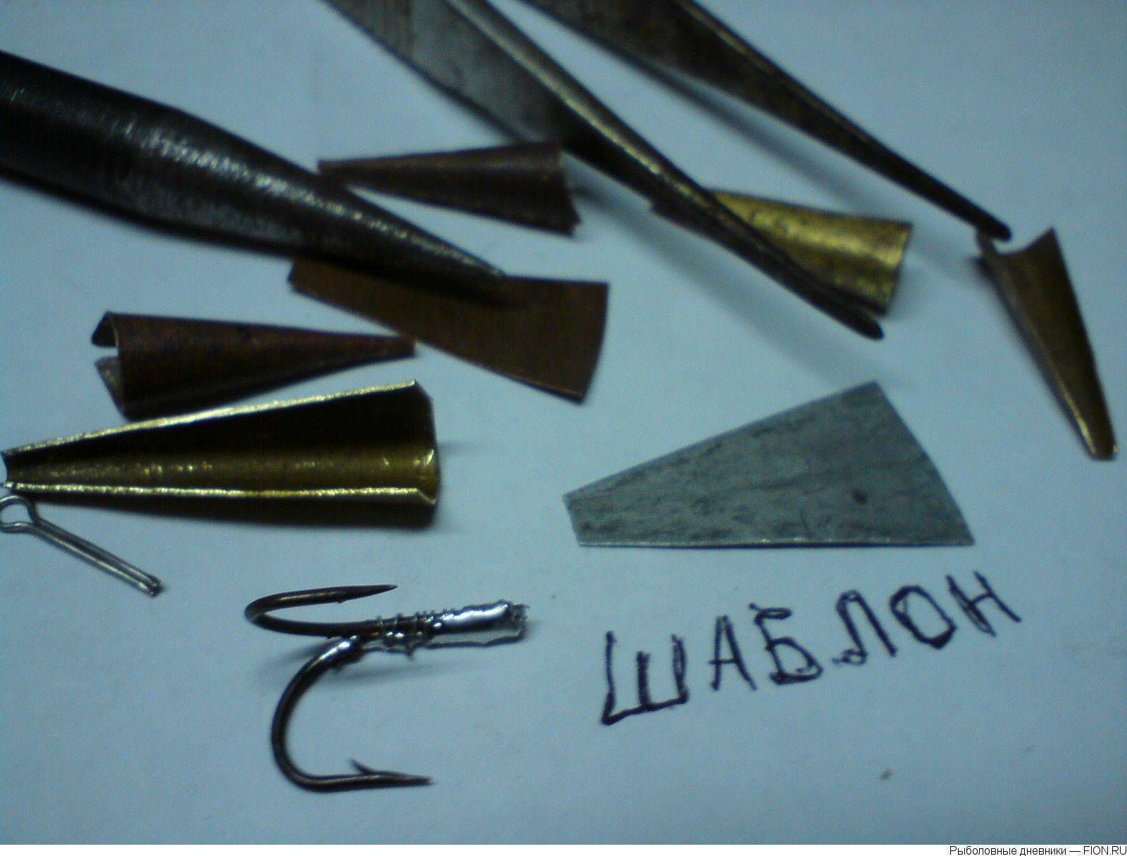 Ниже приводятся фото блесны на налима зимой, на которых изображены самодельные изделия и фабричные. Заготовка и размеры блесны. Что надеть на крючок. Дабы ловля налима зимой на стукалку была эффективной, необходимо использовать следующие типы ниживок: Морепродукты; Потроха курицы Изготовить данную снасть своими руками довольно просто. Первым делом необходимо сделать небольшой конус из тонкого листа металла и вставить в него крючок. Крючок устанавливается таким образом, чтобы жало выходило из заострённой части конуса.