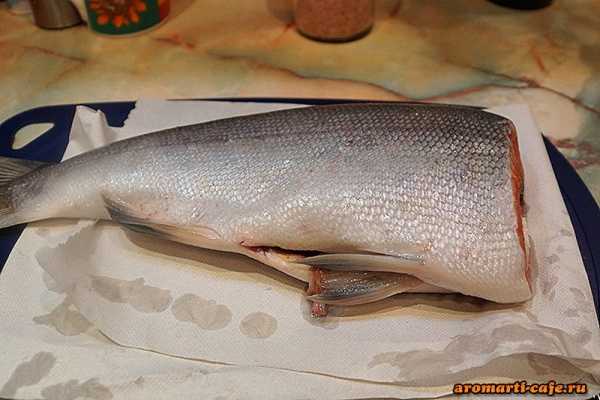 Если рыба мороженная, то даем полностью разморозиться естественным путем, при комнатной температуре. Если рыба неразделанная, то удаляем внутренности и голову, как и описано выше. Если купили уже разделанную рыбу без головы, то просто протираем внутреннюю полость полотенцами, не моем.