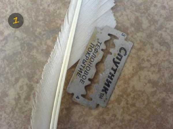 Для начала нужно очистить стержень от пуха. Трудность в том, чтобы не поломать стержень и не нарушить цельность полой трубки, в противном случае внутрь будет поступать вода. Чаще всего от пуха избавляются, подержав перо над открытым огнем. Если уверены в своей аккуратности, то можно и лезвием срезать. Но в таком случае это место нужно обработать мелкой наждачкой.