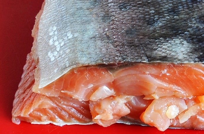 Следующим шагом будет разделка красноватой рыбы. (Смотрите видео ниже) Если у вас есть рыба с головой и хвостом, то вам нужно будет отделить эти части от рыбы.Закидывать хвост и голову не стоит. Потому что они могут пригодиться для приготовления пикантной ухи или ухи, но не пригодятся для соления. От оставшейся тушки рыбы нужно отрезать все плавники. Саму тушку нужно разрезать на очень большие куски, но они должны будут пойти в ваше приготовленное блюдо. Секрет в том, что огромные дольки солят как надо, а потом еще больше, можно сделать чудесные вырезки, если уж из маленьких кусочков рыбы. Кусочки рыбы нужно разрезать прямо с кожицы.Теперь положите их на доску.
