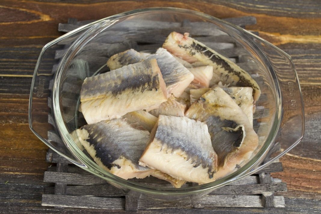 Для простого приготовления вам потребуется очистить селедку от потрохов, плавников и чешуи, нарезать нужное количество кусочками.