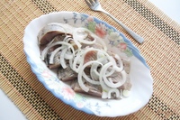 Соус из горчицы и белого вина прекрасно сочетается со многими видами рыбы, и сельдь не является исключением. Следующий рецепт острой закуски из сельди сочетает в себе картофель, сельдь, лук и горчичный соус, создавая полноценный рецепт закуски.Селедку приправляют лимонным соком и жарят на гриле, картофель варят, а лук подают в сыром виде, чтобы получился хрустящий и пикантный гарнир.