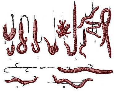 Надевая приманку, следите за тем, чтобы крючок не оказался слишком малым для нее. Для исключения ложной поклевки обратите внимание на то, чтобы приманка не слишком свисала с крючка. Червя надевают на крючок следующим образом: жало крючка протягивается почти через всего червя. Если червь крупный, его сворачивают кольцами и через каждое кольцо пропускают крючок.