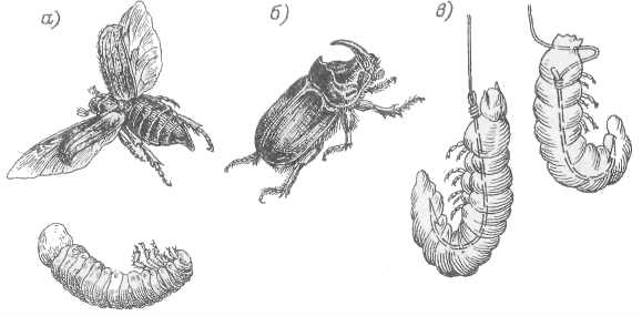 а) Майский жук и его личинка; б) Жук-носорог; в) Насадка личинки жука-носорога.