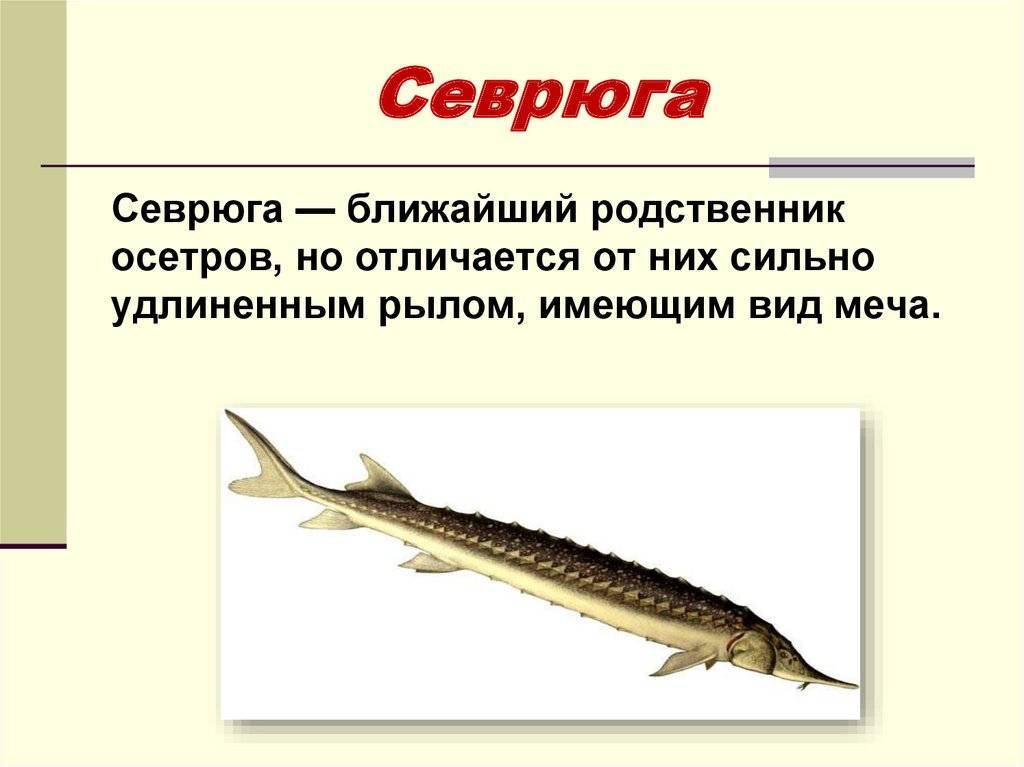 4. Севрюга обитает в бассейнах Азовского, Черного и Рыба севрюга бывает озимая и яровая. Для вытянутого тела севрюги характерно наличие длинного носа, выпуклого лба, узких и гладких усиков и слабо развитой нижней губы. Сбоку и сверху тело рыбы покрыто плотным покровом щитиков. Спина и бока имеют синевато-черный окрас, а брюхо — белое. Севрюга редко достигает более 5 м в длину и 50 кг веса.
