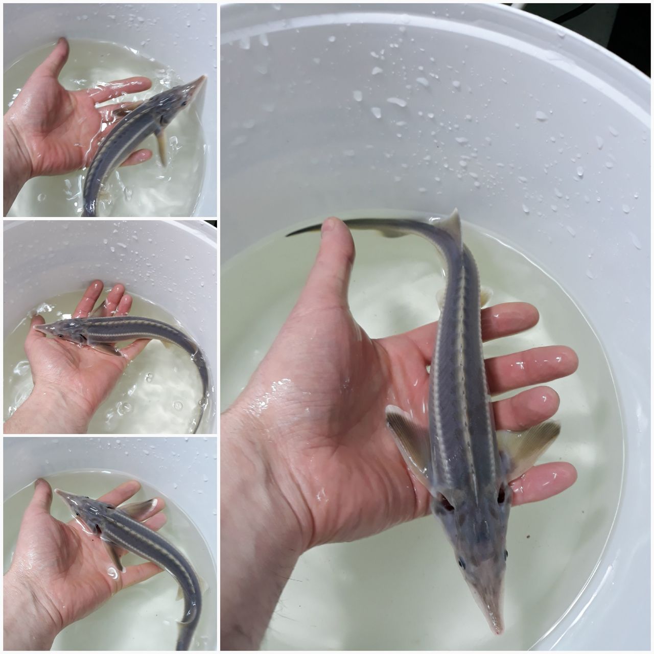 Бывает аквариумный вид осетровых. Это небольшая рыбка, длина которой не превышает 18 сантиметров. Аквариумный вид по внешнему облику — почти как атлантический осетр, только очень маленький. Сравните фото выше, где представлен атлантический осетр, а также фото ниже, где на фото изображен аквариумный вид. Отличия заключаются лишь в том, что у аквариумной рыбы меньше белых пятен на теле.