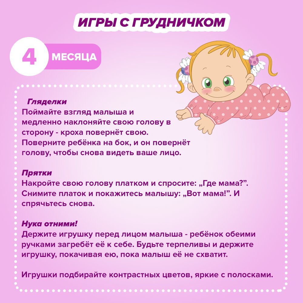 Возраст 4 месяцев — важный этап в развитии ребенка. Малыш активно познает мир, учится новым навыкам. Родителям важно создавать развивающую среду, много общаться с ребенком, играть в развивающие игры. При этом нужно помнить, что все дети развиваются индивидуально. Не стоит сравнивать своего малыша с другими детьми. Главное — обеспечить ребенку любовь, заботу и внимание.