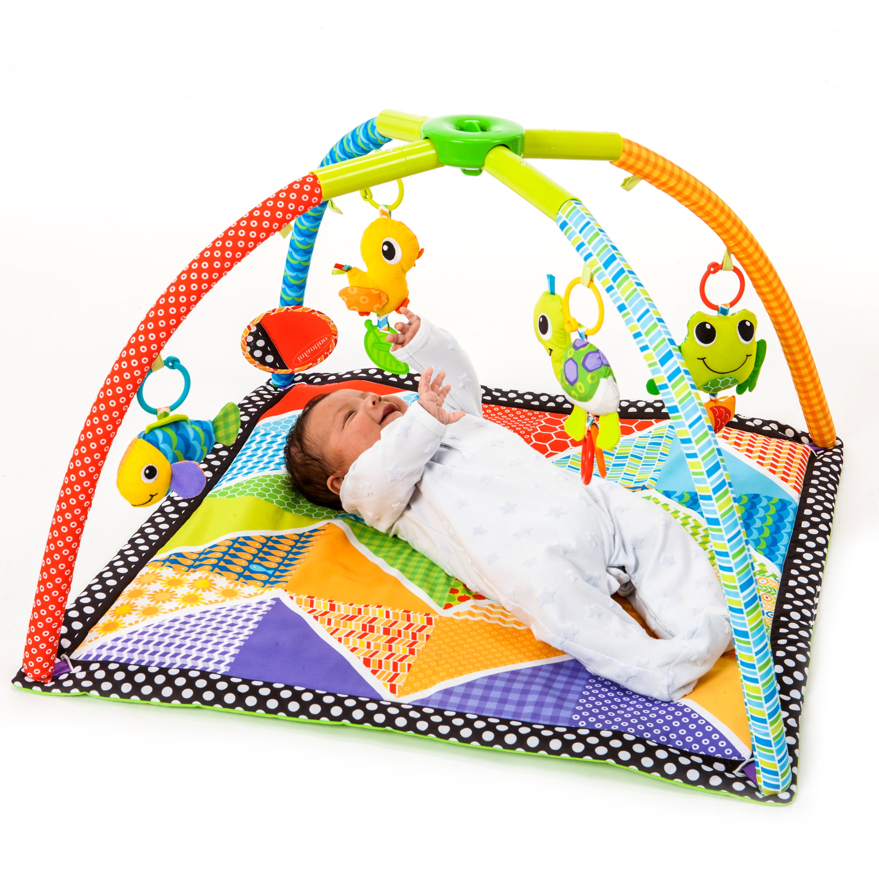 Это классический вариант развивающего коврика. Он состоит из мягкого коврика-основы и дуг, на которые крепятся различные игрушки — погремушки, прорезыватели, мягкие игрушки, зеркальца. Такие коврики подходят для детей с рождения.