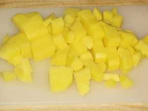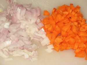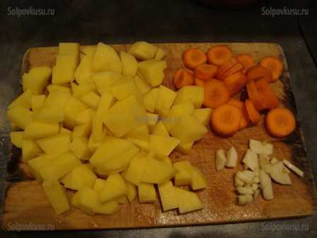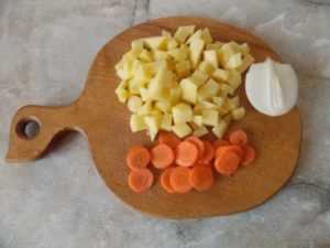 2. Морковь, картошку режем кубиками, лук очищаем, но не режем, луковицу потом выбросим.