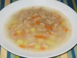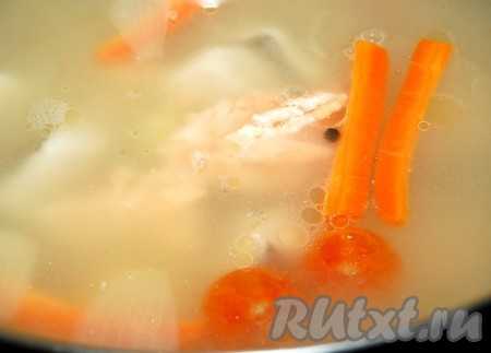 4. Закладываем в бульон морковь, лук, картофель, порционные куски из лосося, снятое с костей его вареное мясо.
