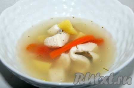 Когда овощи в бульоне будут почти готовы, добавить кусочки филе рыбы. Посолить, поперчить и добавить лавровый лист.