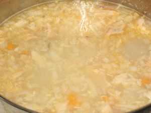 3. Через 15 минут варки добавляем морковь, картошку, лук, пшено, варим еще 20 минут.
