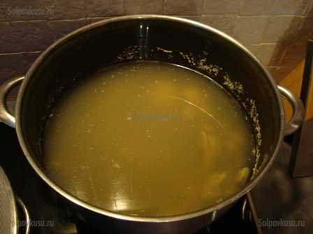 Через 45 минут процедить бульон через сито. Отходы выбросить, а бульон снова поставить вариться.