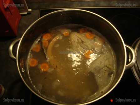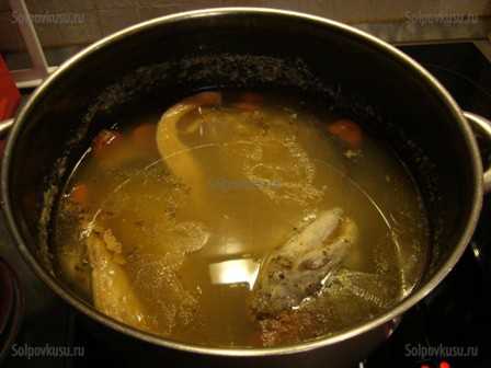 4. За 2-3 минуты до готовности кладем соль, перец, лаврушку. По желанию вливаем рюмку водки и окунаем на 2-3 секунды головешку в бульон.