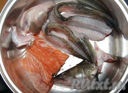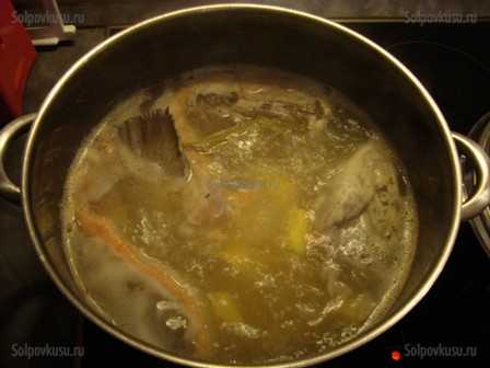 1. В кипящую воду добавляем голову, плавники, хвост, варим 40-50 минут.