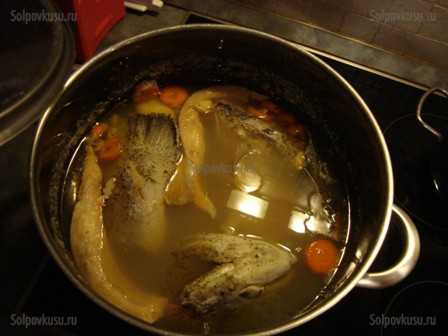 Как бульон для ухи закипит, бросаем туда овощи и головы рыб (если есть).