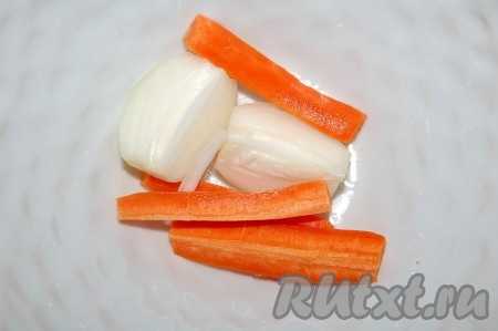 Почистить и нарезать морковь и репчатый лук. Отправить их также в кастрюлю с бульоном.