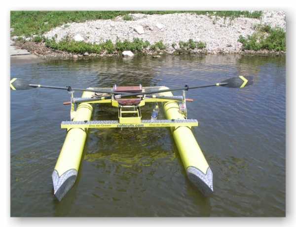 Такая конструкция позволяет установить на катамаран любое движущее устройство, начиная от лопастей, приводимых в движение педалями, и заканчивая бензиновыми двигателями.