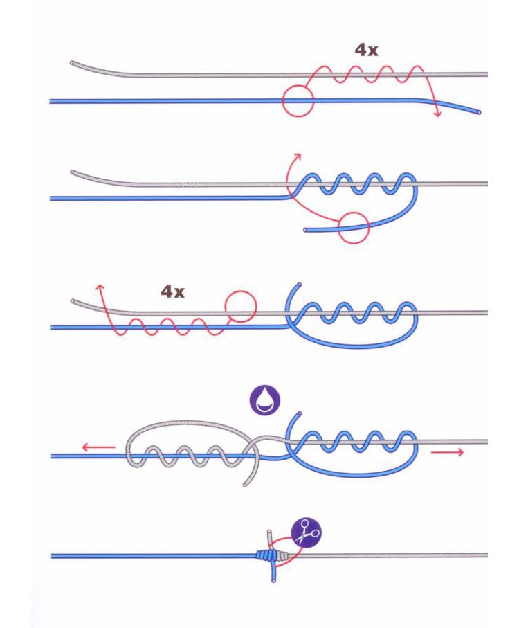 При помощи данного соединения также можно надежно закрепить на плетенке крючок либо вертлюжок. Техника его выполнения не предусматривает каких-либо сложностей. Причем его можно использовать и для плетеной, и для обычной лески.