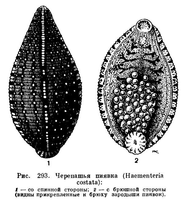 Возможно, что в родстве с птичьими пиявками находится черепашья пиявка (Haementeria costata). Ее довольно легко узнать по прерывистой (пунктирной) узкой светлой полоске и ряду мелких сосочков, идущих посередине спины (остальные ряды сосочков проходят снаружи от срединного ряда). Обычная длина взрослых червей около 20 м, но встречаются и более крупные экземпляры. Окраска от зеленоватой до почти коричневой. Глаз одна пара. Паразитирует главным образом на болотной черепахе (Emys orbicularis), но довольно часто попадается и в свободном состоянии. В период размножения всегда оставляет своего хозяина. Иначе во время нередких выходов черепахи на сушу молодые пиявки, кожные покровы которых очень нежны, быстро погибали бы. Черепашьи пиявки могут в некоторых случаях сосать кровь птиц, млекопитающих и человека. Выдающийся русский зоолог А. О. Ковалевский, посвятивший этому виду прекрасную монографию, рассказывает, как пиявки сосали у него кровь между пальцами ног, когда он ходил в воде около берега, собирая материал для своей работы. Черепашья пиявка в нашей стране часто встречается только на юге (Украина, Кавказ и т. д.). Других видов этого рода у нас нет. Между тем в Африке (южнее Сахары), Южной Азии и Южной Америке, а также на юге Северной Америки видов Наеtеnteria много, сосут они кровь главным образом водных пресмыкающихся и земноводных, которые, как известно, многочисленны в теплых и жарких странах. Некоторые виды гементерий из Центральной и Южной Америки имеют большие размеры, чем наша черепашья пиявка, и используются там для медицинских целей. Эти пиявки сосут также и кровь птиц.