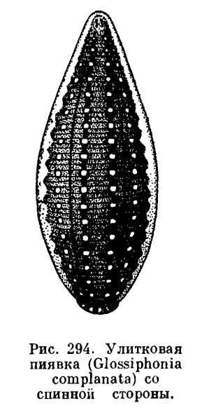 Самая известная представительница глоссифонид в наших пресных водоемах, по родовому названию которой названа и все семейство, — улитковая пиявка (Glossiphonia complanata). Тело ее, длина которого редко превосходит 15—20 мм, относительно очень широко. Окраска зеленовато-коричневая, очень изменчивая, иногда весьма пестрая. На спинной стороне три пары продольных рядов сосочков, из которых срединные развиты лучше других. Взрослая пиявка на редкость ленива и много времени неподвижно лежит, присосавшись к подводным предметам и к широколистным растениям г. Благодаря своей окраске и неподвижности, покрытая нередко частицами ила, она почти или совсем незаметна. Ее главные жертвы — преимущественно легочные брюхоногие, мягкотелые (прудовики и др.)» которые нередко после ее нападения погибают в результате потери крови и других соков или закупорки дыхательного отверстия. Овладение пиявкой своими жертвами облегчается медлительностью названных моллюсков.