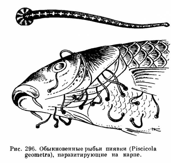 Рис. 296. Обыкновенные рыбьи пиявки (Piscicola geometra), паразитирующие на карпе