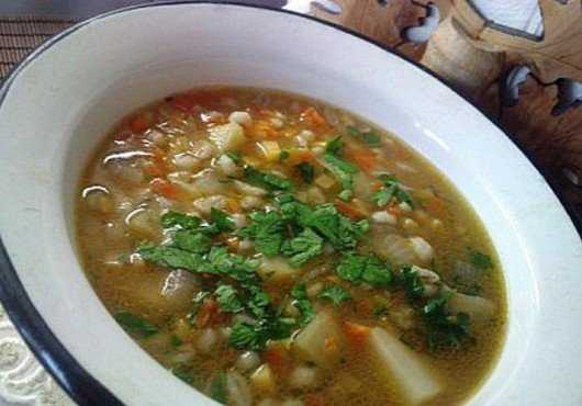 - Снова доводим до кипения и всыпаем промытую перловку (5 столовых ложек).