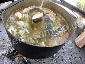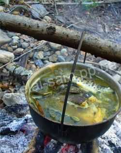 - Уха должна покипеть еще пять минут на медленном огне, а потом в костер добавляют дрова и в уху опускают крупные куски рыбы. Они должны быть довольно крупными, не меньше пяти сантиметров в ширину.