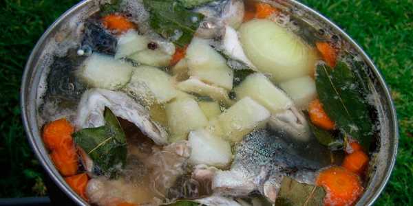 - Рыбную мелочь заливают холодной водой и ставят на костер. Варят долго, пока не получится густой, даже немного вязкий бульон.
