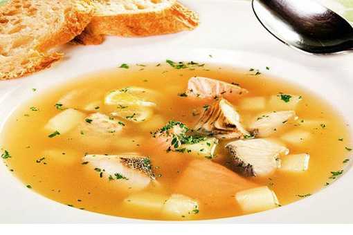 Из мелкой рыбы, рыбьих голов, костей и плавательных пузырей сварить бульон, процедить, положить в него очищенный и нарезанный крупными кусками картофель и репчатый лук. За 10−15 минут до готовности добавить нарезанные куски крупной рыбы, перец, лавровый лист, сливочное масло. Расход продуктов: рыба мелкая — 300 гр, рыба крупная — 250 гр, картофель — 450 гр, масло сливочное — 20 гр, лук репчатый — 1 головка, перец — 4−6 горошин.
