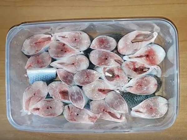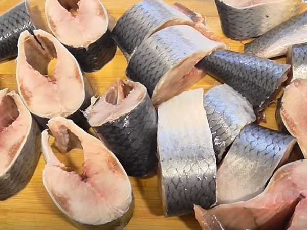2. У рыбы отрезаем голову и хвост. Разрезаем брюшко и убираем все внутренности. Также очищаем всю черноту внутри. Промываем под проточной водой и разрезаем на порционные кусочки. Складываем их в контейнер или банку.