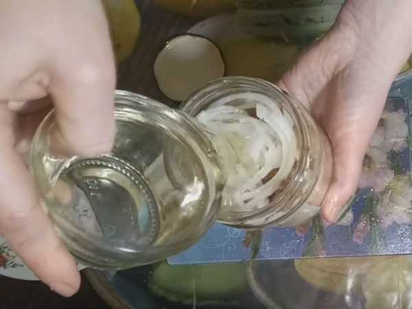 - На дно банки положить немного замаринованного лука, следующий слой — кусочки селедки, затем снова лук, и снова селедка.