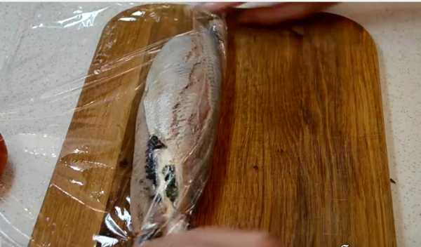 Спустя час достаем селедку и натираем ее смесью из специй. Кладем рыбу на тарелку и обматываем пищевой пленкой. Оставляем селедку на столе на полтора-два часа.