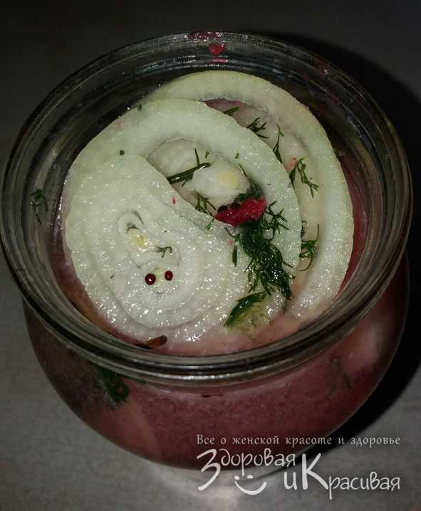 В это время приготовим рассол. В теплой кипяченой воде растворяем ложку соли. В литровую банку выкладываем кусочки рыбы, плотно утрамбовываем. Чистим и режем полукольцами лук, отправляем его к селедке. Заливаем селедку рассолом комнатной температуры, сверху добавляем растительное масло. Плотно закрываем крышкой и ставим в темное прохладное место на сутки. Затем ставим еще на сутки в холодильник.