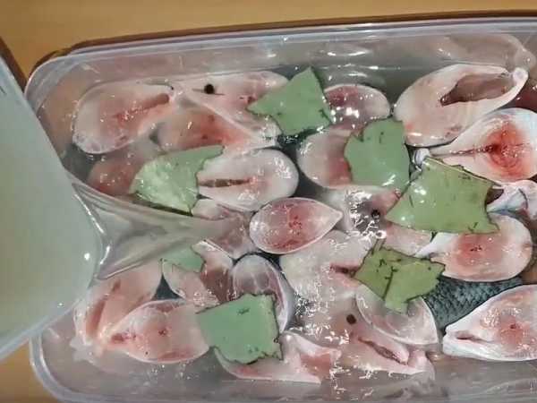 3. Рассол остыл. Заливаем им рыбу. Чтобы она не всплывала, сверху ставим груз. Засекаем ровно 2 часа. Она должна находиться при комнатной температуре.