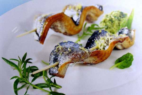 Складываем получившиеся кусочки в глубокую тарелку, натираем солью, перцем и другими специями по вкусу, поливаем соком одного лимона; сильно мариновать рыбу не стоит, достаточно десяти-пятнадцати минут. Дальше надеваем сельдь на деревянные шампура и выкладываем на заранее разогретое масло в сковороду. Обжаривать шашлычки следует по несколько минут с каждой стороны. Подавать можно с соусами, листьями салата, зеленью.