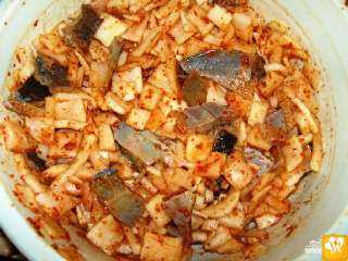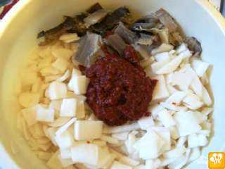 Смешиваем дайкон, камбалу и перцовую пасту (тоже продается в магазинах, хотя можно приготовить и самому).