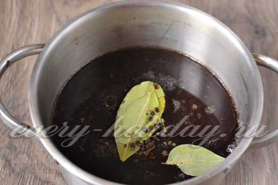 - Отдельно приготовить специальный рассол. Для этого сначала надо заварить чай (примерно ¾ стакана), дать ему настояться примерно 15 минут и процедить. Далее можно добавлять все остальные ингредиенты по рецептуре.