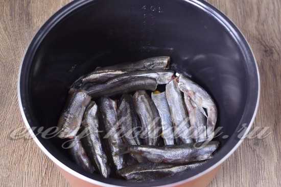 - Подготовленную мойву уложить плотными рядами в чашу мультиварки.