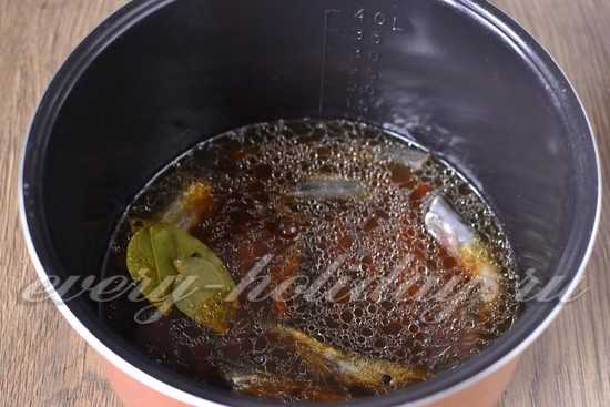 - Выложить мойву в чашу мультиварки, залить чайно-соленой смесью.