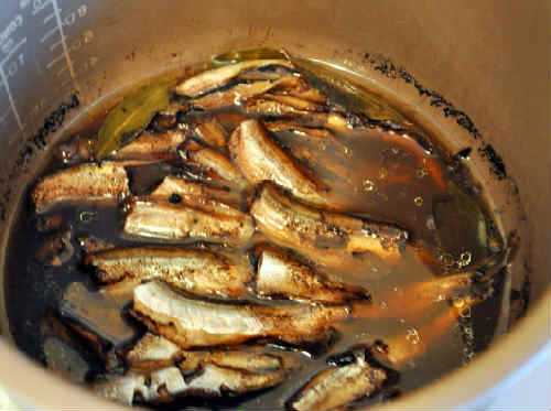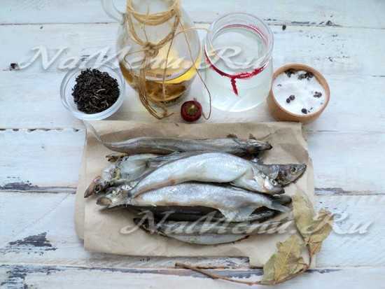 В этом случае понадобится: 1 килограмм мойвы свежемороженой, 10 грамм соли, стакан воды, 3 бутончика гвоздики, 5 горошин черного и 4 душистого перца, 60 миллилитров подсолнечного масла, 3 столовые ложки соевого соуса, 3 лавровых листа и 5 столовых ложек чайной заварки.