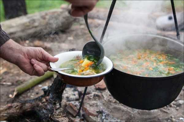 Когда картофель почти сварится, опустить рыбу: мелкую — целиком, а крупную — нарезанную на куски. Через 20 минут котелок снять с костра.