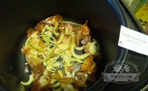На дно чаши мультиварки насыпаем луковую шелуху, на нее — порезанный лук.