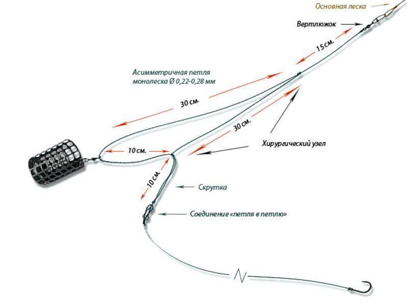 Способов собрать фидер с асимметричной петлей много. Одним из популярных методов изготовления снасти является так называемая петля Гарднера. Это универсальный метод, благодаря которому будет ловиться карась даже при полном отсутствии ветра и на течении. Кормушка здесь фиксируется за счет специального отводного узла. Поводок и основная леска – единое целое.