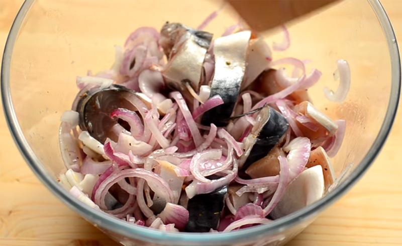 Скумбрия соленая с морковью и луком. Маринованная скумбрия с луком
