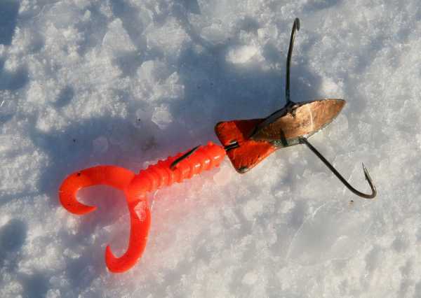 Первый способ получил наибольшее распространение. Это ужение на специальную блесну «стукалку». Купить ее нет возможности, т. к. изготавливается она в кустарных условиях. Берут медную пластину и вырезают из нее заготовку. По продольной оси высверливают отверстия в центре.Туда вставляется колечко. Два крючка размером как минимум 10, связывают и размещает по центру. Заготовка заливается свинцом. Напильником убирают излишки свинца, чтобы получилось ровно закругленное основание.