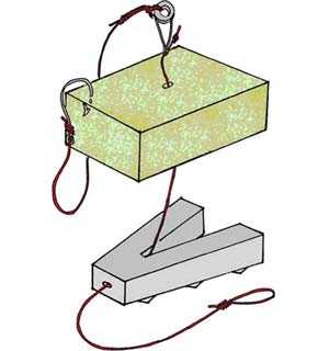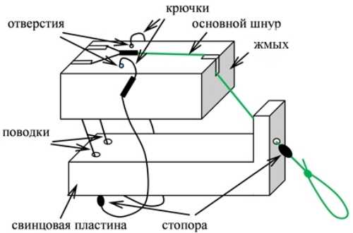 - Оснастка со стационарным грузилом. При таком способе оснастки грузило должно иметь плоскую форму (прямоугольную, ромбическую, треугольную, овальную). Оно крепится к основной леске неподвижно. К концу лески привязывается вертлюжок или делается петля. К вертлюжку или петле монтируются поводки с крючками. Крепить макуху к грузилу можно капроновым шнуром подходящего цвета. Для этого делаются пропилы (вдоль и поперек бруска) или сверлится центральное отверстие.