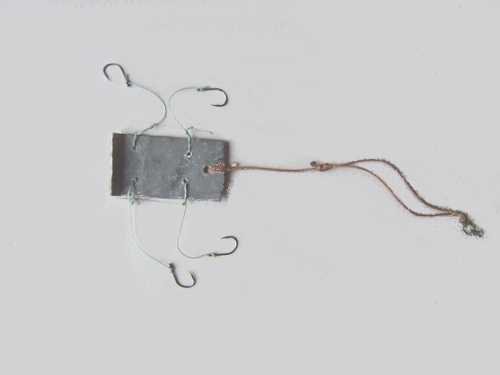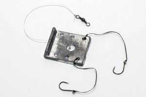 - Третий вид снасти считается наиболее популярным, так как он основан на плоском квадратном грузиле из свинца с бортом. Упорный борт защищает жмых от крошения, в случае столкновений с чем-либо в воде. Также плоская форма груза позволяет ему всегда находиться над дном. Макуха затягивается петлей с кольцом. В проделанные отверстия проводятся крючки.