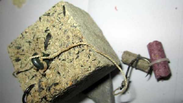 Крючки обычно втыкаются в брусок жмыха. Но лучше их спрятать в приманке, сделав несколько прорезей. Затем аккуратно в них уложить крючки и леску и замазать эти места глиной или мякишем хлеба. В таком виде оснастка забрасывается в воду.
